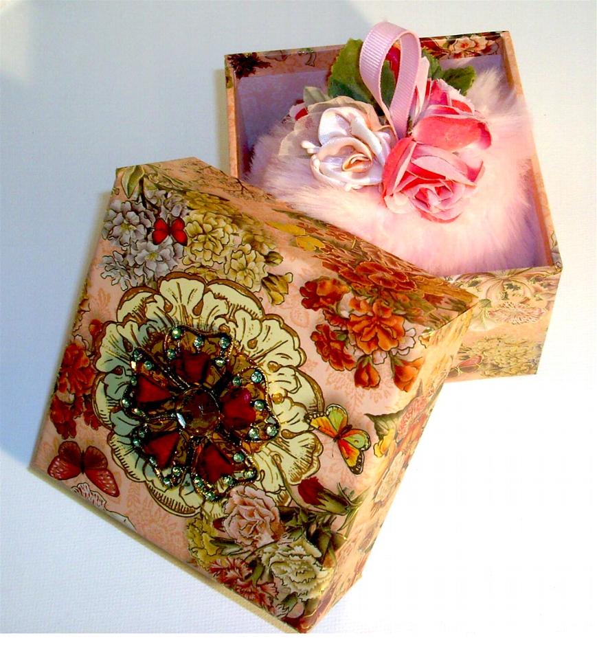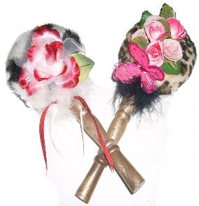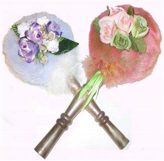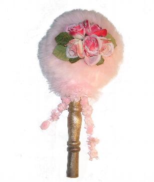 Refillable powder wands are adorned with feathers and roses on one side, or may be ordered undecorated. Measurements are 5" x 10"